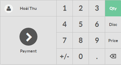 Ở phía bên phải bạn có thể thấy danh sách sản phẩm với danh mục ở bên trên. Nếu bạn nhấn vào một sản phẩm thì sản phẩm đó sẽ được thêm vào giỏ hàng. Bạn cũng có thể sửa lại số lượng hoặc khối lượng cho sản phẩm đã chọn bằng cách gõ trực tiếp từ bàn phím.