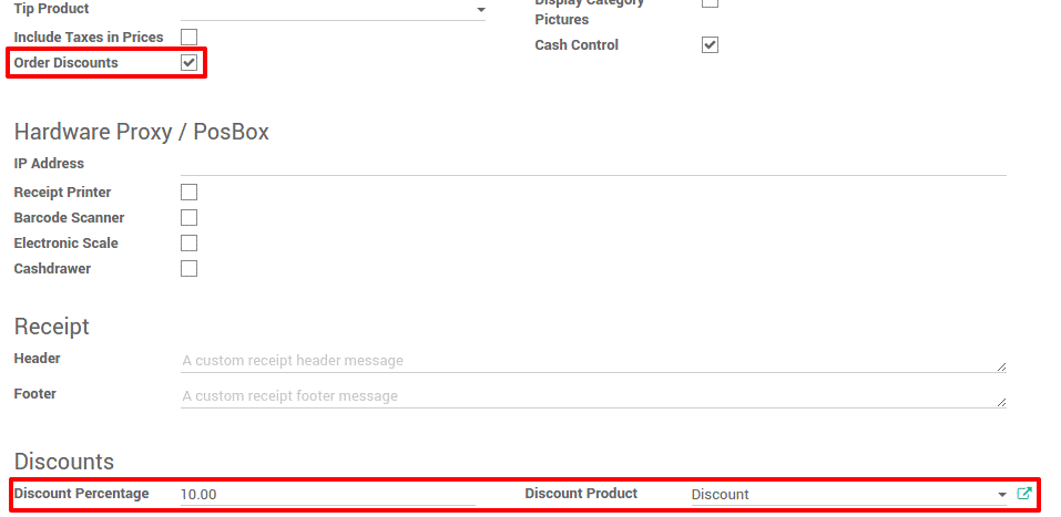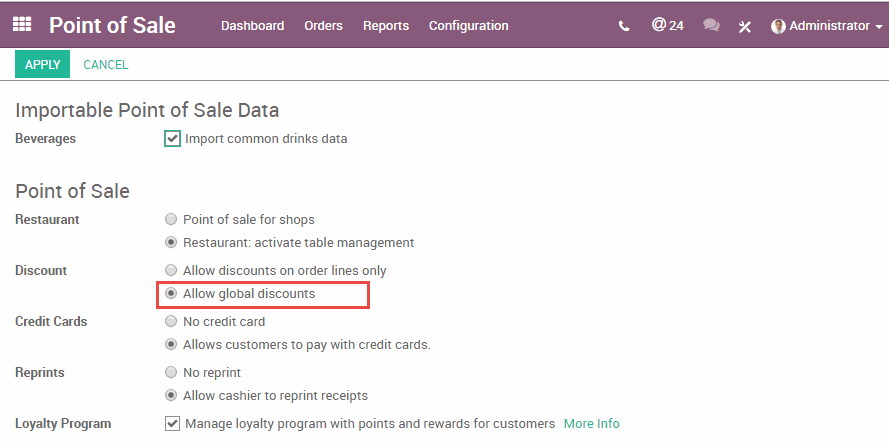 Chọn menu Configuration (Cấu hình) -> Setting (Cài đặt). Tích chọn vào ô Allow global discounts (Cho phép giảm giá trên toàn đơn hàng)