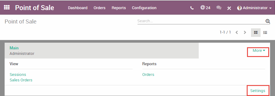 Sau đó từ bảng điều khiển (Dashboard) trong phân hệ điểm bán hàng nhấp chọn More (Thêm) -> Setting (Cài đặt)