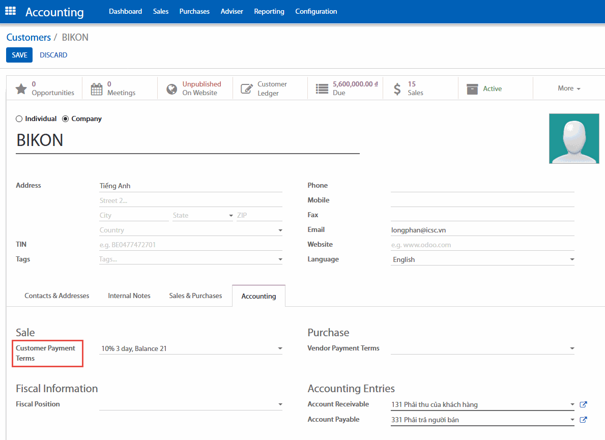 Khách hàng: các điều khoản thanh toán sẽ tự động áp dụng cho các đơn đặt hàng mới hoặc hóa đơn cho khách hàng. Hãy cài đặt điều khoản thanh toán cho khách hàng nếu như bạn cần đặt điều khoản này cho tất cả các hóa đơn sau này của cùng một khách hàng.
