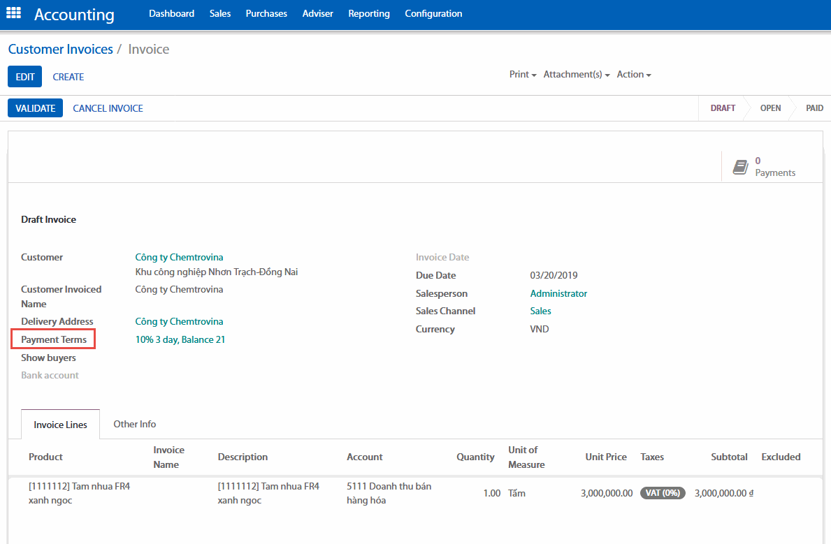 Để quản lý các kế hoạch thanh toán liên quan đến một hóa đơn, bạn nên sử dụng các điều khoản thanh toán của phần mềm. Chúng áp dụng cho hóa đơn của khách hàng và cả hóa đơn của nhà cung cấp.