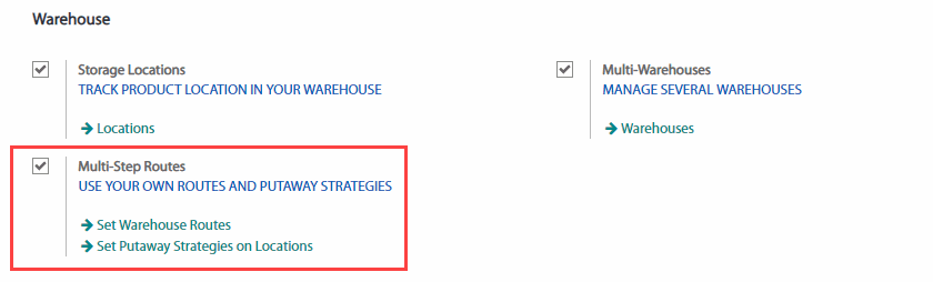 Trong mụcỞ phần Warehouse (Kho), Check vào nút Multi-Step Routes (Các tuyến nhiều bước) như hình:
