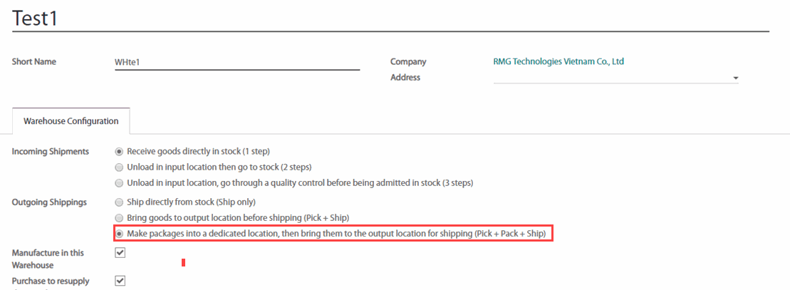 Một số bước cấu hình cần thiết để hoàn tất Pick + Pack + Ship trong Phần mềm. Các bước này có thể tạo thêm các địa điểm mà theo mặc định được gọi là Output và Packing Zone. Vì thế, nếu mã kho của bạn là WH thì cấu hình này sẽ tạo ra một địa điểm gọi là WH/Output và một địa điểm khác tên là WH/Packing Zone.